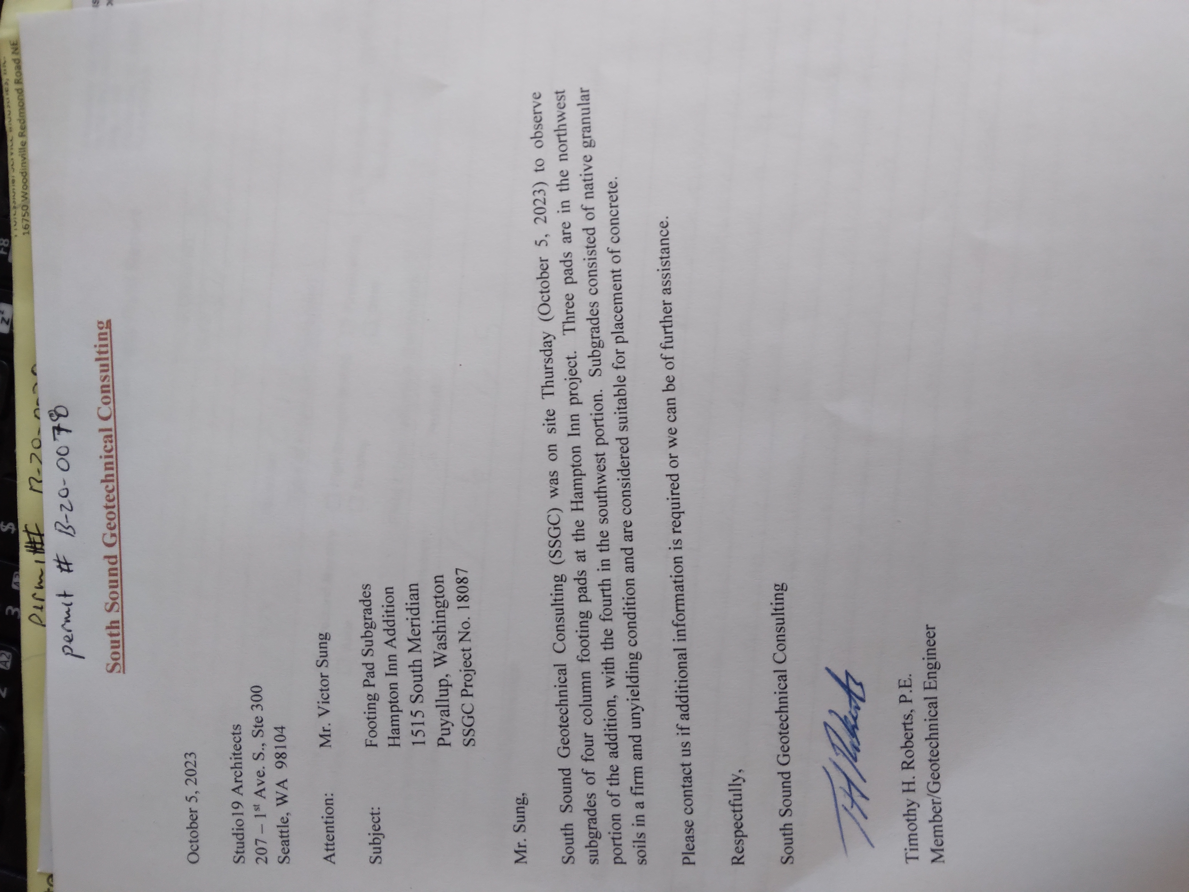 1 ; provide Geo-tech approval for soil bearing of 4,000 psf as required per structural sheets of city approved plans.