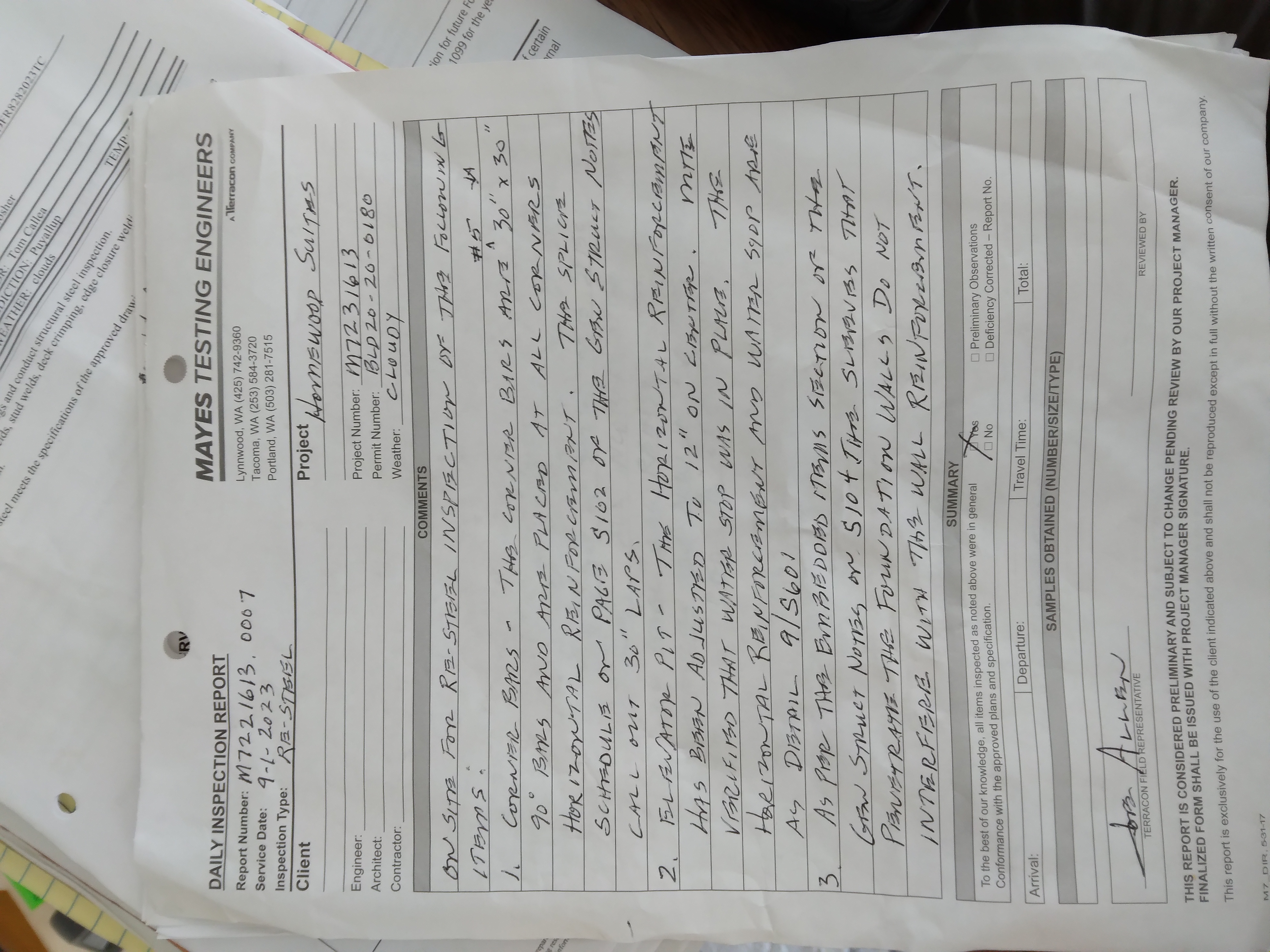| Foundation/Rebar Inspection | Partial Pass | 9/5/2023 | 9/5/2023 | 09/05/2023 |