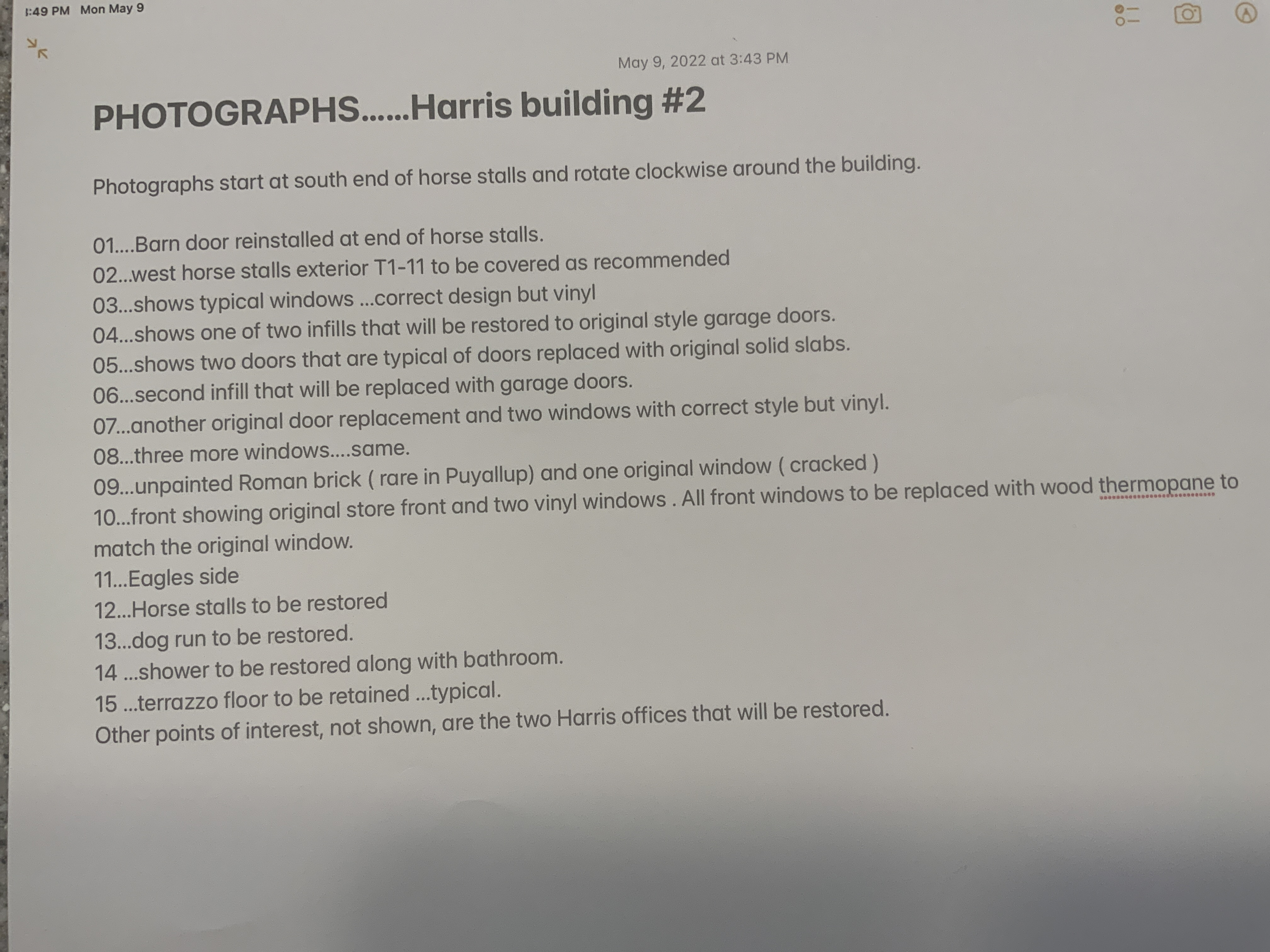 Image directory (doc name "image directory.jpeg") includes a list and descriptions of the photos. The descriptions for photo numbers 2, 4, 6, 10, 12, 13, 14 include references to proposed work (e.g. restoration, replacement, etc.). Please correct to only call out the historical/architectural significance of the element being shown in the photo. If any photos were provided only for reference to future proposed work, please remove from the list and inform staff which ones have been eliminated so they are not included in a future package to the Board.